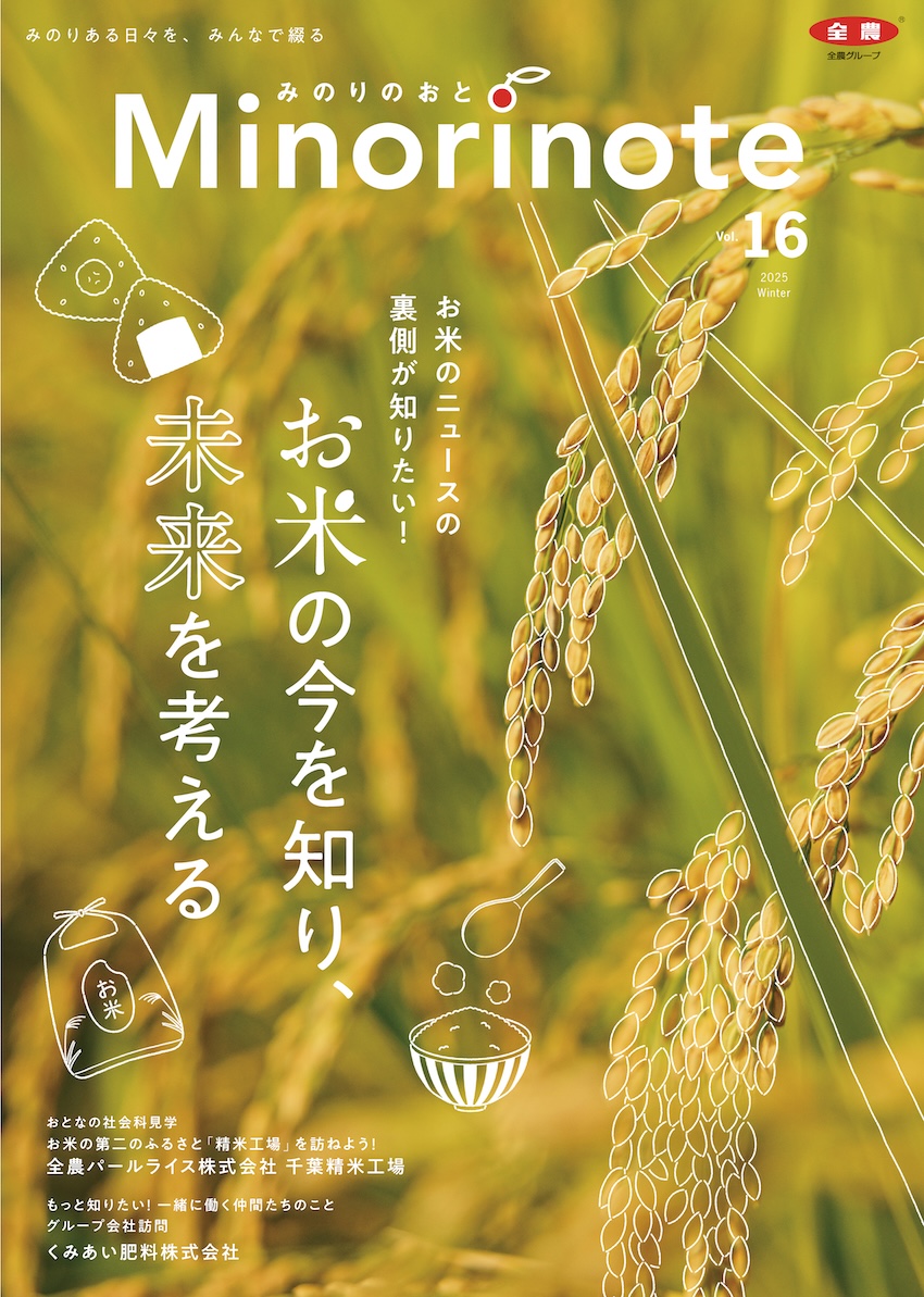 全農グループで働く全ての人が輝き、つながり、分かち合う場所を作りたい。そんな想いで創刊した全農グループ広報誌『Minorinote(みのりのおと)』。今号で取り上げるのは、昨今話題となっている米事情です。お米にまつわるニュースや専門家へのインタビュー、全農グループの備蓄米担当者の声、お米の生産・流通に関わる仕事紹介など、さまざまな角度からお米の「今」と「未来」を知ることができる特集となっています。ほかにも、全農パールライスの精米工場を訪れた「おとなの社会科見学」や、くみあい肥料を訪れる「グループ会社訪問」など、情報満載でお届け。全農グループで働く仲間一人ひとりの想いや情熱、挑戦が、どんな“みのり”につながったのか……ぜひご覧ください。